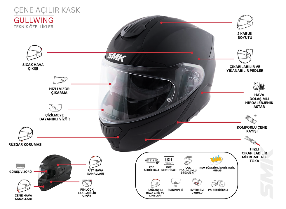 SMK Gullwing, Dahili Güneş vizörü, Rüzgar kesici ve Pinlock®70 uyumlu vizör gibi eksiksiz bir özellik yelpazesi sunar. Düz renkler ve yüksek görünürlüklü grafiklerle sunulan bu kasklar size eksiksiz bir Stil ve Güvenlik sunar!